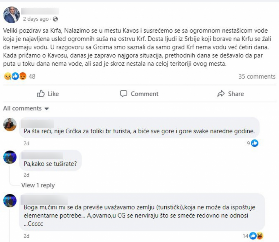 - Veliki pozdrav sa Krfa, Nalazimo se u mestu Kavos i susrećemo se sa ogromnom nestašicom vode koja je najavljena usled ogromnih suša na ostrvu Krf. Dosta ljudi iz Srbije koji borave na Krfu se žali da nemaju vodu. U razgovoru sa Grcima smo saznali da samo grad Krf nema vodu već četiri dana. Kada pričamo o Kavosu, danas je zapravo najgora situacija, prethodnih dana se dešavalo da par puta u toku dana nema vode, ali sad je skroz nestala na celoj teritoriji ovog mesta - rekao je jedan turista iz Srbije.