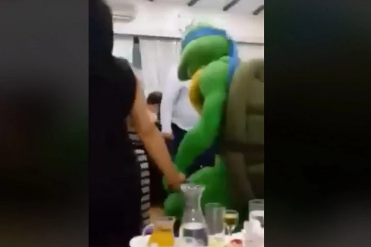 Foto: Fejsbuk/Leonardo duplo cescePod punom "ratnom opremom" jedan zabavljač imao je zadatak da na dečjem rođendanu zabavlja klince obučen kao nindža kornjača Leonardo.