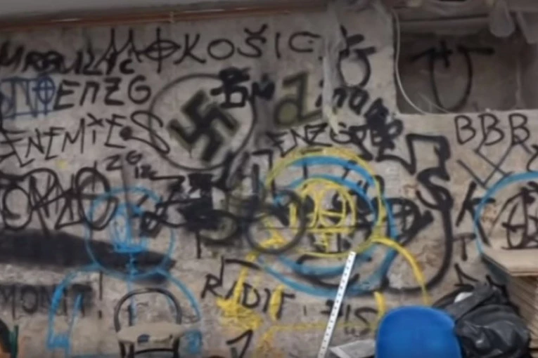 Na snimku se vide prostorije u užasnom stanju, na čijim zidovima dominiraju kukasti krst, kao i grafiti posvećeni Adolfu Hitleru i Anti Paveliću.