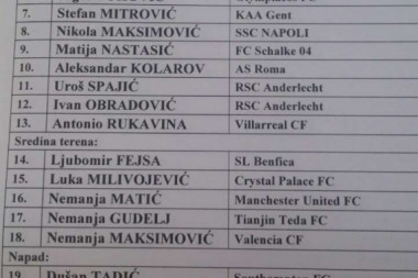 Selektor fudbalske reprezentacije Slavoljub Muslin saopštio je spisak igrača za predstojeće utakmice protiv Moldavije i Republike Irske u kvalifikacijama za Mundijal u Rusiji 2018. godine. Muslin je vratio u nacionalni tim fudbalera Torina Adema Ljajića, ali na spisku i dalje nema jednog od najboljih igrača na svetu Sergeja Milinkovića-Savića.