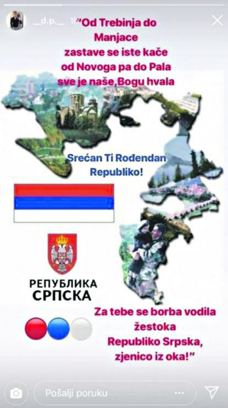 Foto: instagram.com/printscreen- Od Trebinja do Manjače zastave se iste kače, od Novoga, pa do Pala sve je naše, Bogu hvala. Za tebe se borba vodila žestoka. Republiko Srpska, zjenico iz oka. Srećan ti rođendan, Republiko Srpska - pisalo je uz fotografiju srpskog entiteta formiranog 1992. godine.