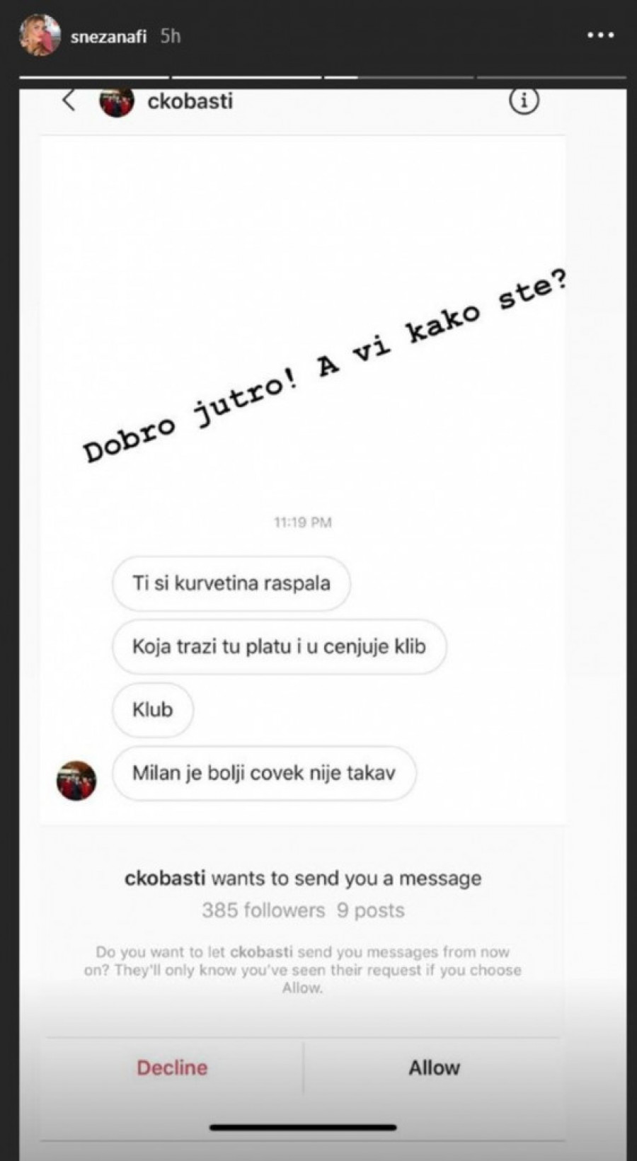- Državo, policijo, mediji? Znam da nije polni organ i nisu uvrede nekog glumca pa verovatno nikome nije zanimljivo. Malo mi prete neki ljudi već dva dana- napisala je Snežana.