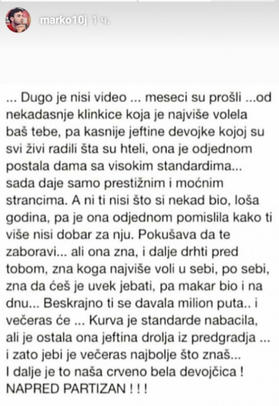 On je poručio da "ona drhti pred tobom, zna da ćeš je uvek j... pa makar bio i na dnu, kako je kur** standarde nabacila, ali je ostala jeftina dr*** iz pregrađa!