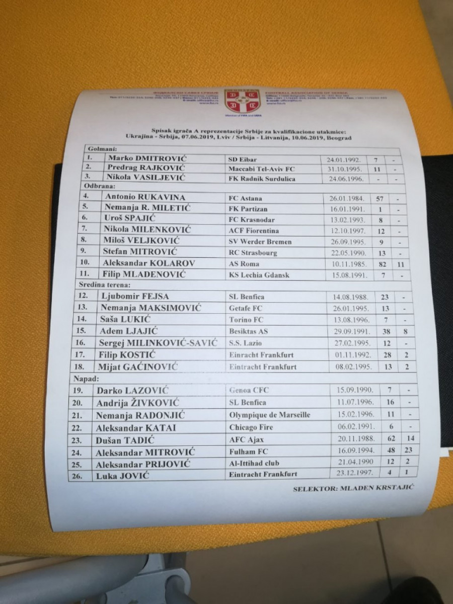 Foto: StarsportNa spisku je bilo nekoliko promena u odnosu na nekoliko prethodnih duela. "Orlovi" će 7. juna igrati u gostima protiv selekcije Ukrajine u okviru 3. kola kvalifikacija, dok će 10. juna u Beogradu dočekati Litvaniju pred praznim tribinama.