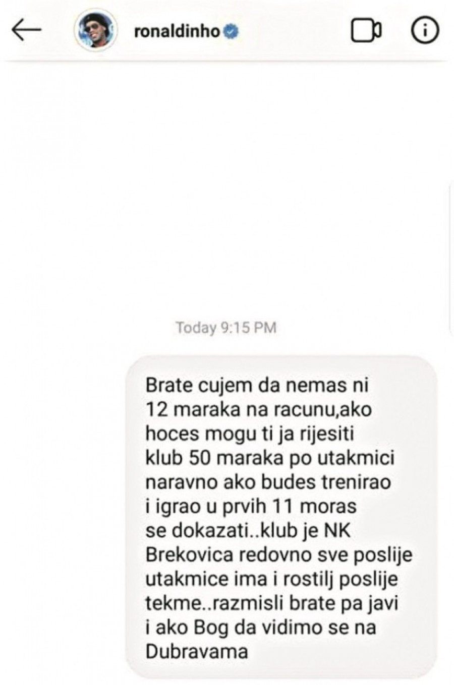 - Brate, čujem da nemaš ni 12 maraka na računu. Ako hoćeš, mogu ti ja rešiti klub - 50 maraka po utakmici. Naravno, ako budeš trenirao i igrao u prvih 11, moraš se dokazati. Klub je NK Brekovica, isplata je posle utakmice, a ima i roštilj - stoji u poruci anonimnog navijača nekada najboljem fudbaleru planete.