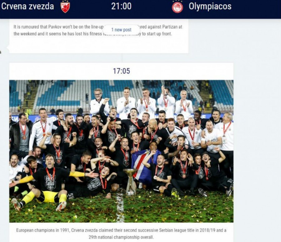 Foto: StarsportNaime, u blogu uživo posvećenom utakmici između Crvene zvezde i Olimpijakosa, post u kojem se predstavljaju uspesi srpskog šampiona ilustrovan je fotografijom igrača i stručnog štaba večitog rivala Partizana.