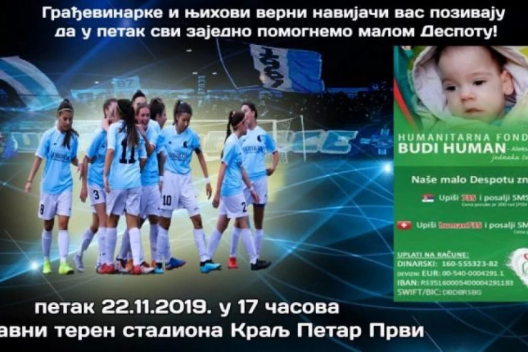 Građevinarke po ko zna koji put pokazuju humanost na delu. Ovog puta ženski fudbalski klub Rad organizuje u petak od 17 časova humanitarnu utakmicu za pomoć malom Despotu.