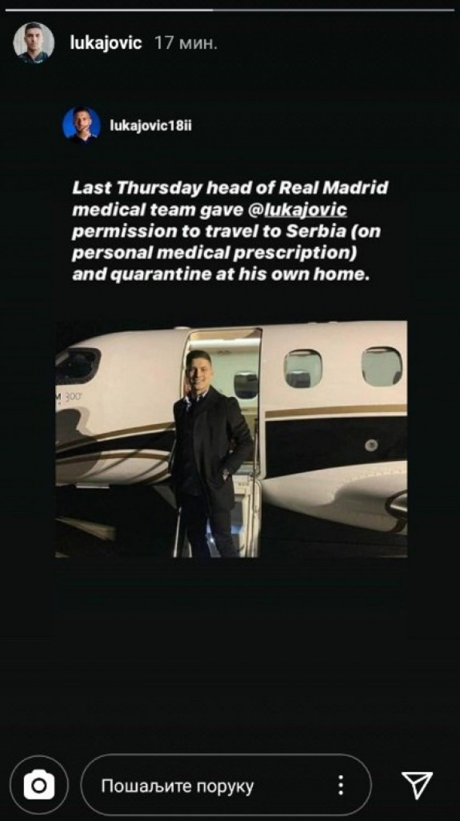 - Prošlog četvrtka šef medicinskog tima Real Madrida je dao dozvolu Luki Joviću da putuje u Srbiju (uz prepisanu terapiju) i da bude izolovan u svom domu- stoji u objavi koju je podelio Luka Jović.