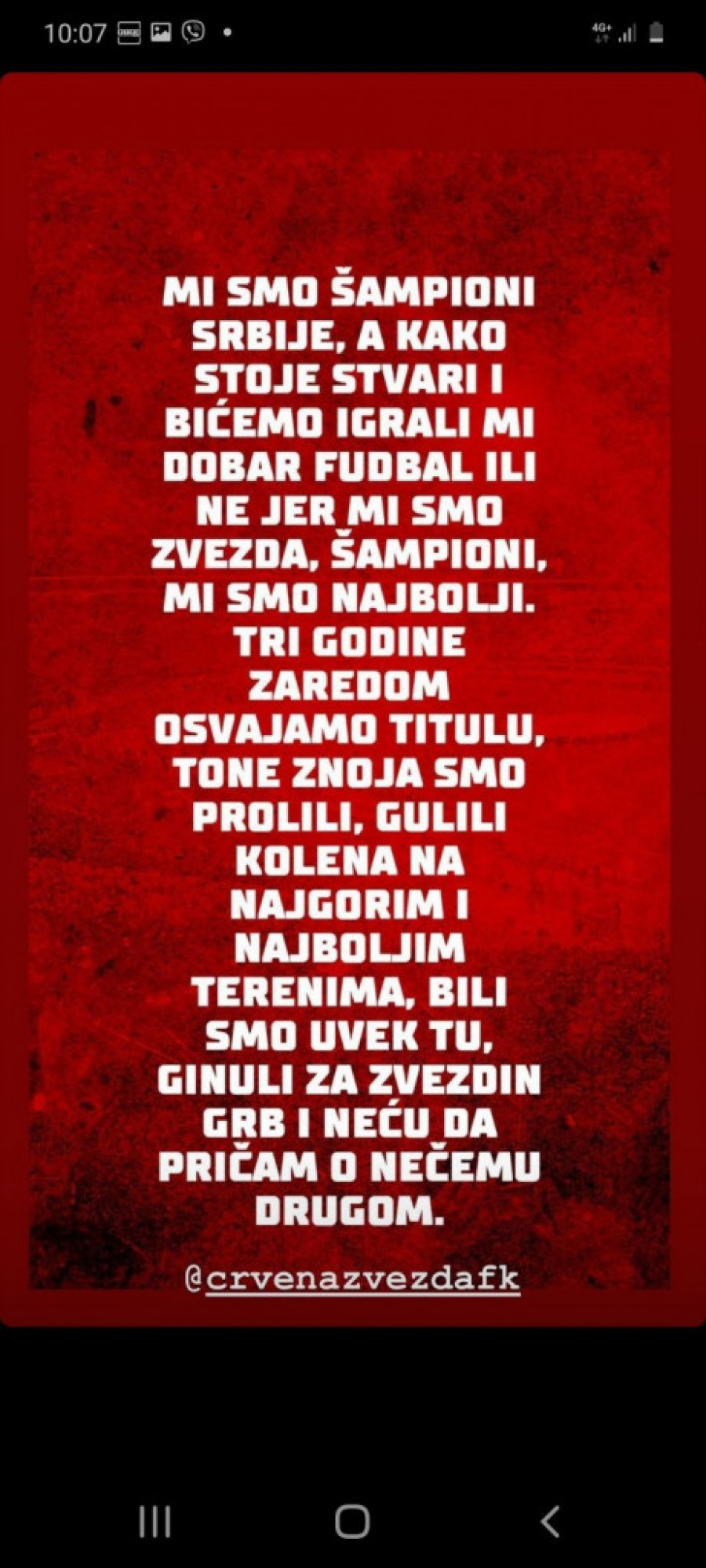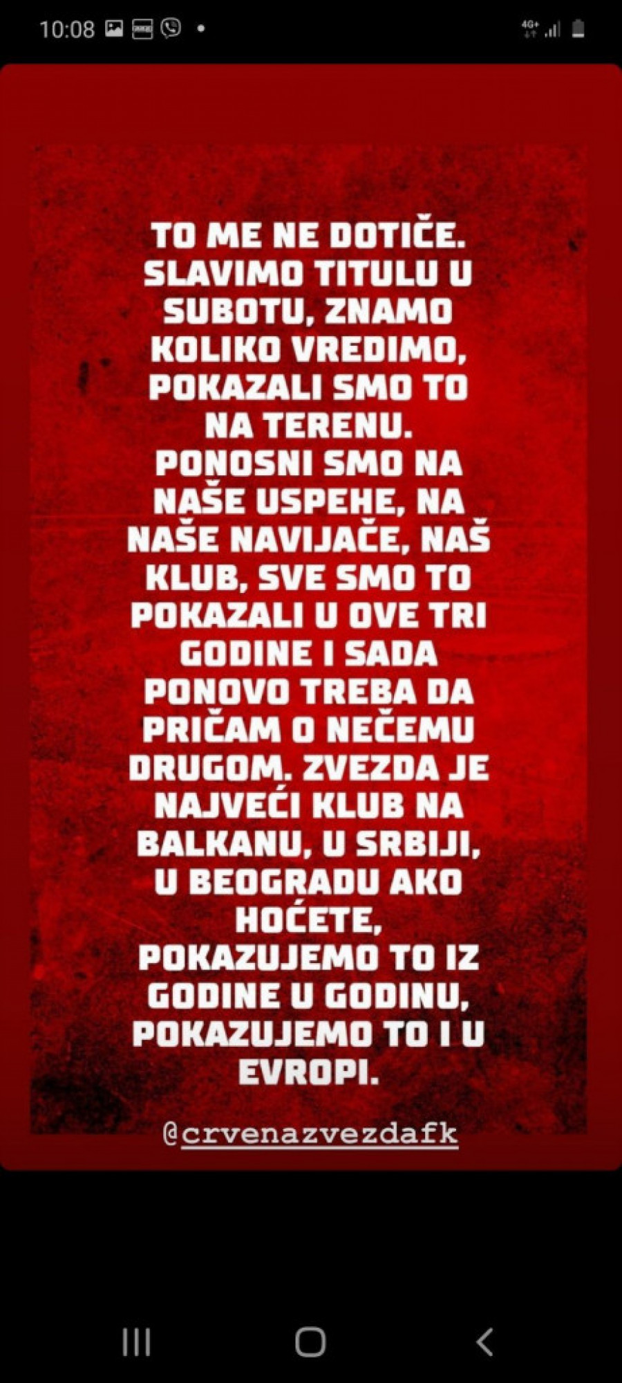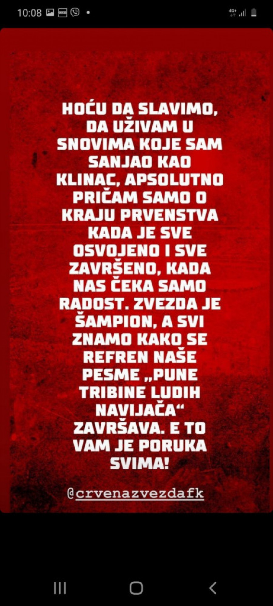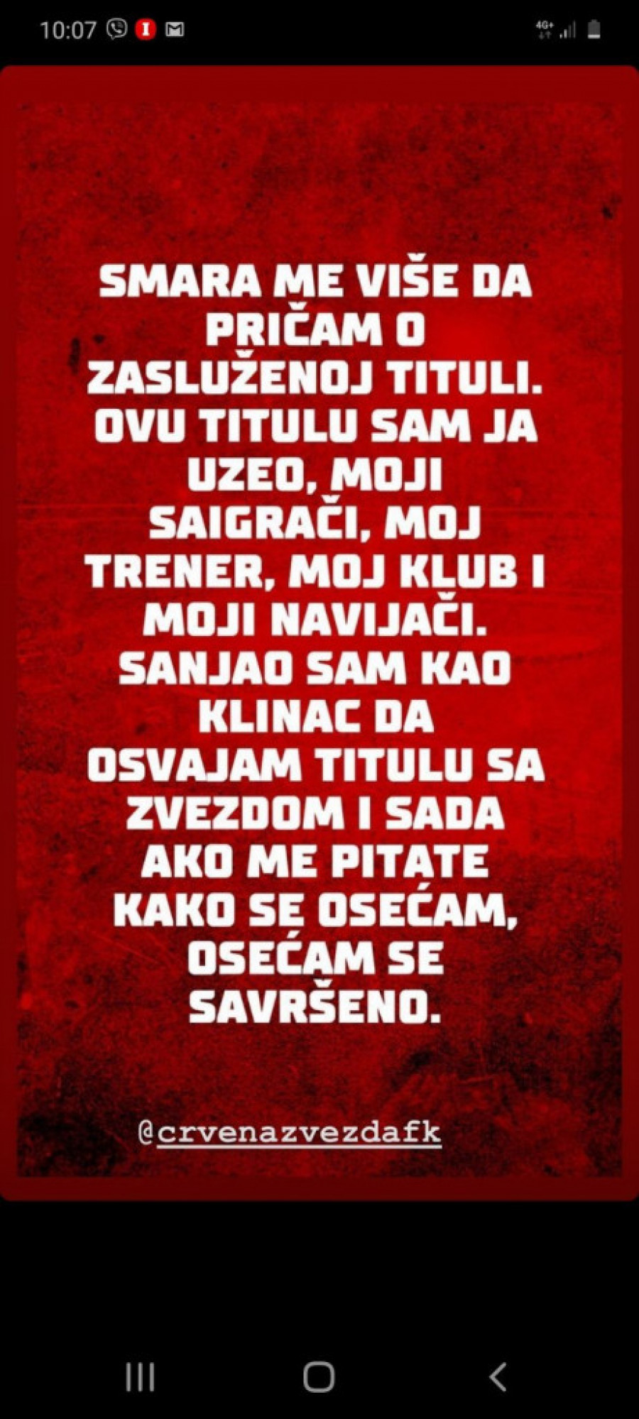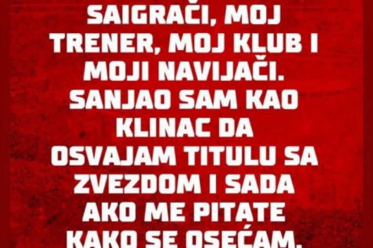 – Smara me više da pričam o zasluženoj tituli. Ovu titulu sam ja uzeo, moji saigrači, moj trener, moj klub i moji navijači. Sanjao sam kao klinac da osvajam titulu sa Zvezdom i sada ako me pitate kako se osećam, osećam se savršeno. Mi smo šampioni Srbije, a kako stoje stvari i bićemo igrali mi dobar fudbal ili ne jer mi smo Zvezda, šampioni, mi smo najbolji- napisao je Milan Borjan.
