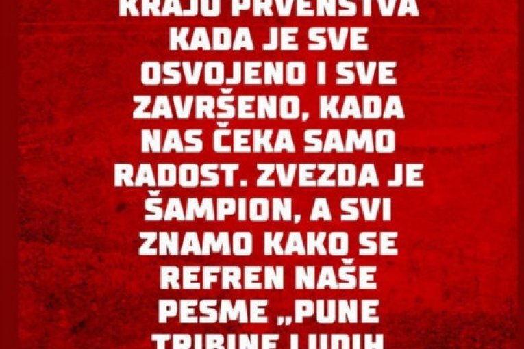 - Tri godine zaredom osvajamo titulu, tone znoja smo prolili, gulili kolena na najgorim i najboljim terenima, bilo smo uvek tu, ginuli za Zvezdin grb i neću da pričam o nečemu drugom. To me ne dotiče. Slavimo titulu u subotu, znamo koliko vredimo, pokazali smo to na terenu. Ponosni smo na naše uspehe, na naše navijače, naš klub, sve smo to pokazali u ove tri godine i sada ponovo treba da pričam o nečemu drugom. Zvezda je najveći klub na Balkanu, u Srbiji, u Beogradu ako hoćete, pokazujemo to iz godine u godinu, pokazujemo to i u Evropi. Hoće da slavimo, da uživam u snovima koje sam sanjao kao klinac, apsolutno pričam samo o kraju prvenstva kada je sve osvojeno i sve završeno, kada nas čeka samo radost. Zvezda je šampion, a svi znamo kako se refren naše pesme ‘Pune tribine ludih navijača’ završava. E to vam je poruka svima – zaključio je Borjan.