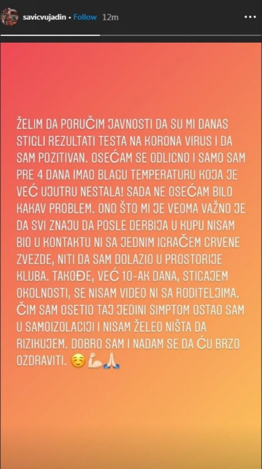 Foto: instagram.com/savicvujadinSaopštenje Crvene zvezde je da će preduzeti sve neophodne korake, ukoliko to bude bilo potrebno i da se za sada fudbaleri neće testirati.