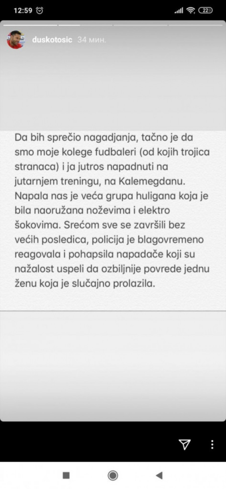 - Da bih sprečio dalja nagašanja, tačno je da smo kolege fudbaleri i ja (od koji trojica stranaca) i ja jutros napadnuti na jutarnjem treningu na Kalemgdanu. Napala nas je veća grupa huligana, koja je bila naoružana noževima i elektrošokovima- otkrio je Tošić u poruci na Instagramu.