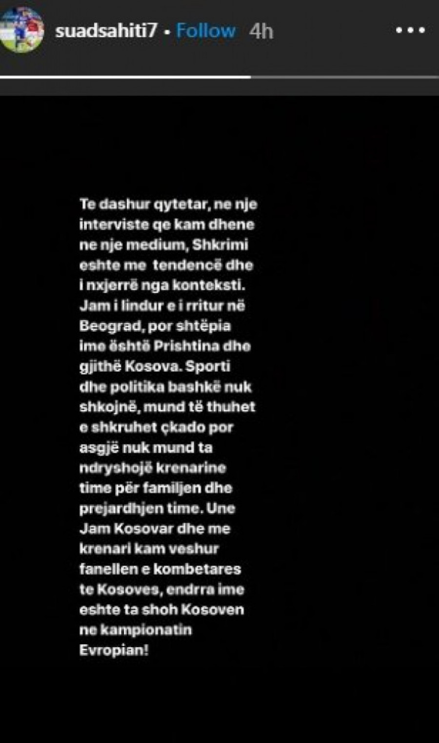 - U jednom intervjuu koji sam dao medijima neke stvari su izvučene iz konteksta. Rođen sam i odrastao u Beogradu, ali Priština je moj dom i celo Kosovo. Sport i politika ne idu zajedno, mogu da piše šta hoće, ja sam ponosan na svoju porodicu i poreklo. Ja sam Kosovar i ponosan sam što nosim dres Kosova. Moj san je da nas vidim na Evropskom prvenstvu - poručio je Suad.