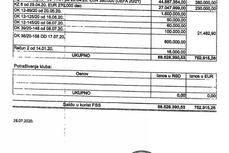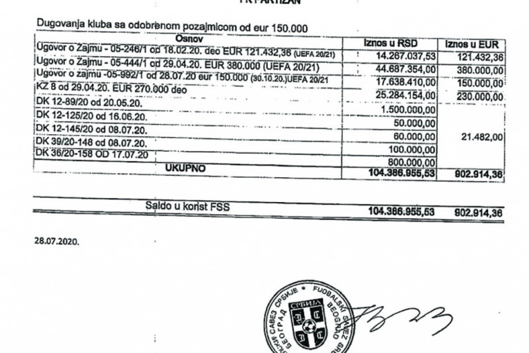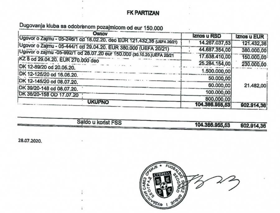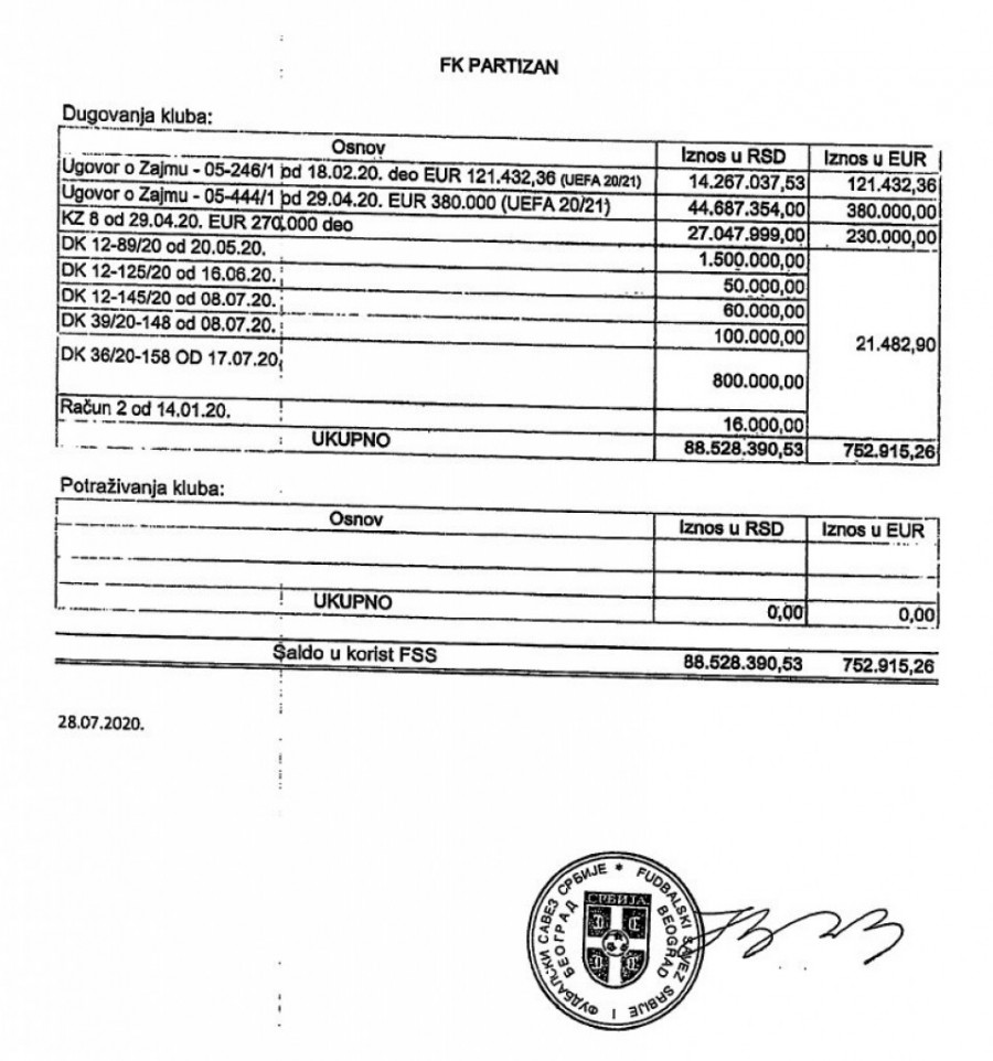 Pre samo tri dana čelnici kluba iz Humske saopštili su na sva zvona da Partizan FSS duguje 411.000 evra, a ne oko milion, kako je navedeno iz Stare Pazove. Uvidom u dokumenta jasno se vidi da je dug crno-belih prema srpskoj kući fudbala tačno 902.914,36 evra. Pritom je ceo minus nastao ove 2020. godine, zaključno sa 28. julom.