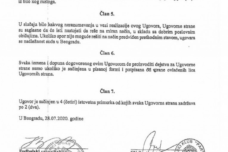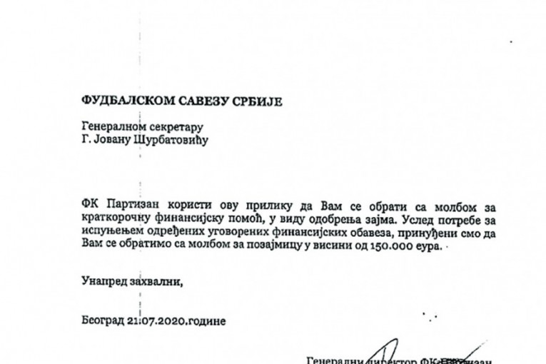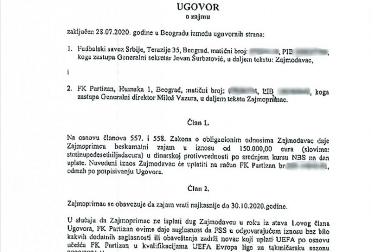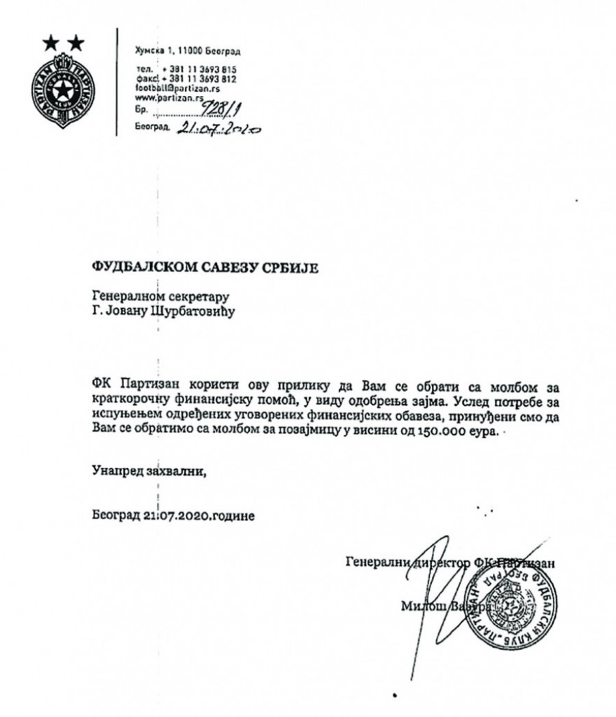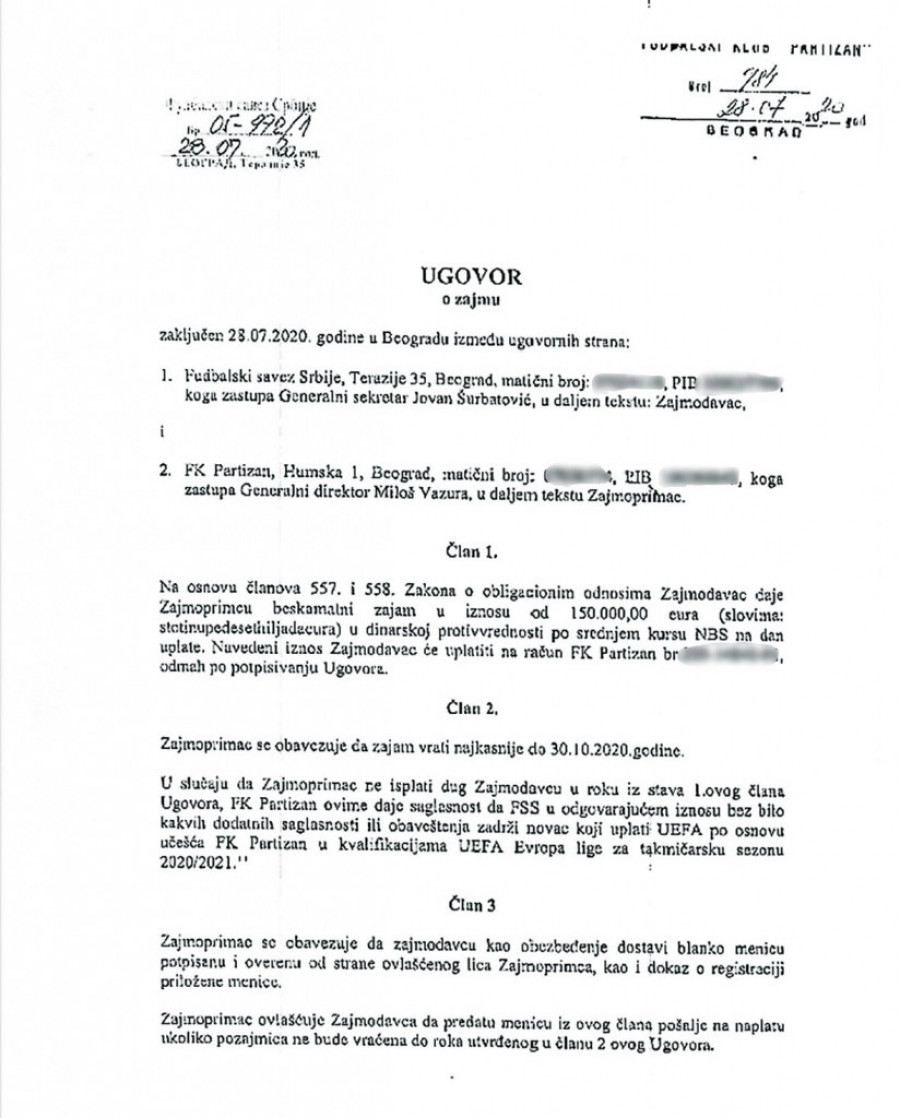 Tog dana je sklopljen ugovor o zajmu Partizana od FSS u iznosu od 150.000 evra. Pozajmica je tražena sedam dana ranije, a pozitivan odgovor je ubrzo stigao. Pritom su sve pozajmice bez interesa, odnosno kamate, a ne komercijalne, kako se tvrdilo iz Humske.