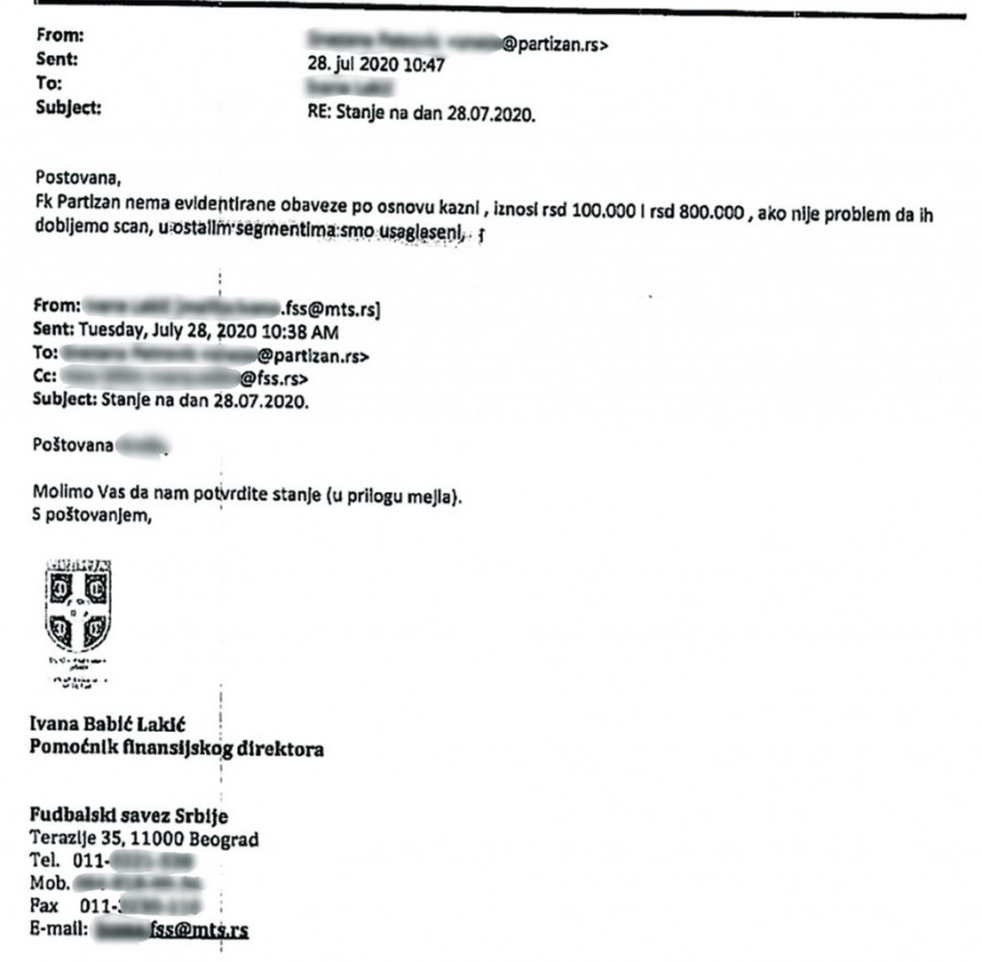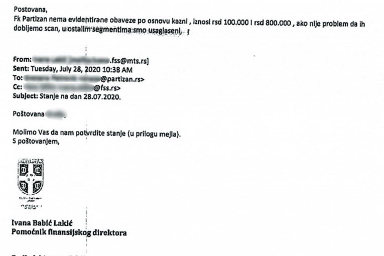 2. LAŽ Partizan nije upoznat sa tvrdnjama iz FSS 2. ISTINA Partizan mejlom potvrdio da su navodi FSS o dugu tačni |