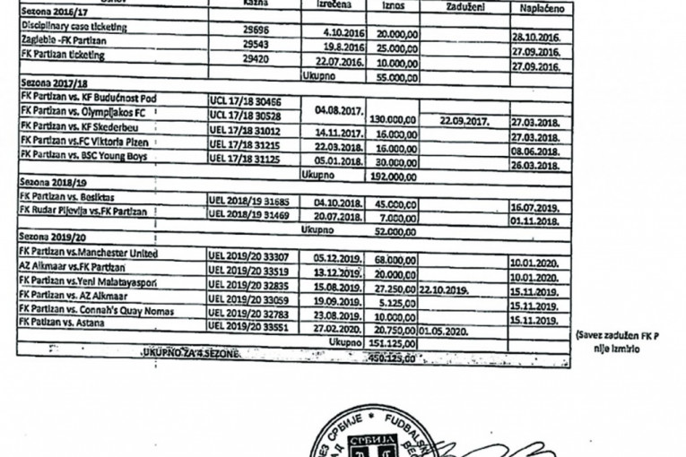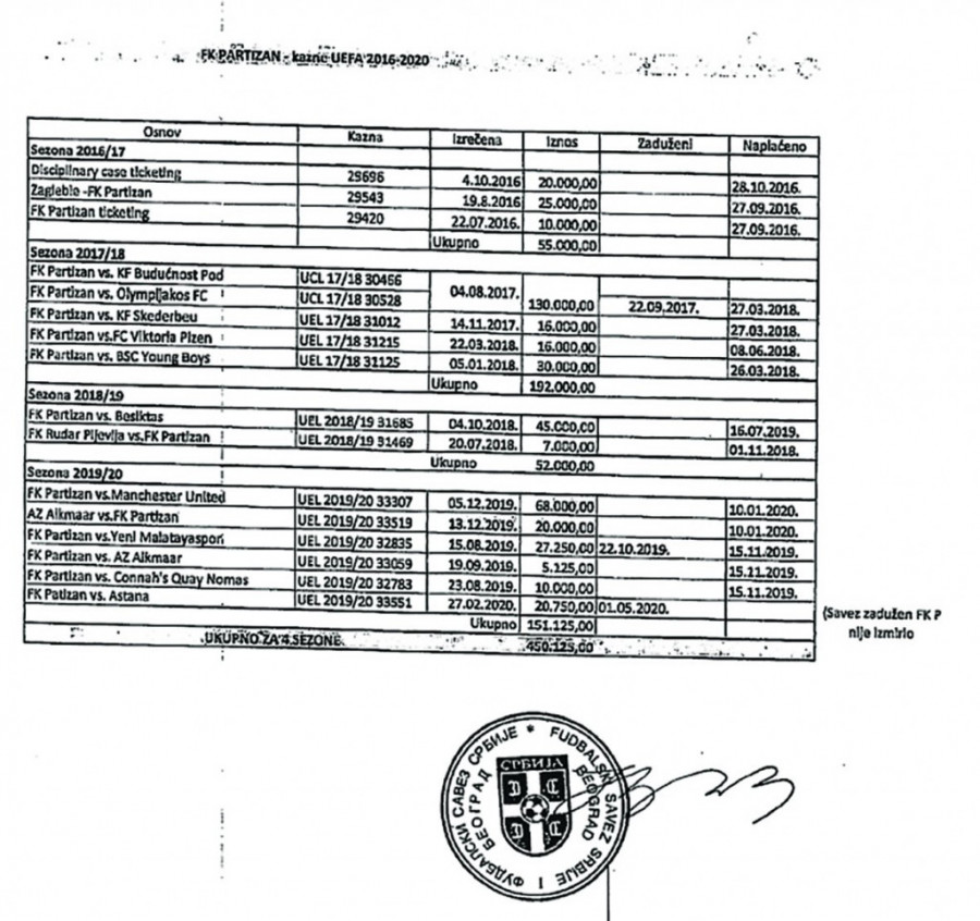 Za poslednje četiri godine FSS jeste izricao kazne Partizanu i ostalim klubovima, ali ih je i pokrivao kod UEFA. Tako je FSS Partizanu, počev od utakmice sa Zaglebjem u sezoni 2016/2017. do danas, platio ukupno 450.125 evra. Istina, crno-beli su taj novac uvek vraćali, ali su u zavisnosti od finansijskih mogućnosti kasnili ponekad i po šest meseci.