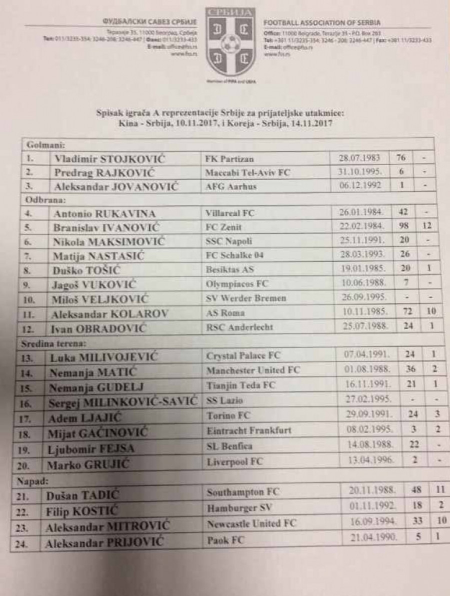 Foto: Tanjug/D. GOLLVršilac dužnosti selektora A reprezentacije Mladen Krstajić saopštio je imena igrača za predstojeće prijateljske mečeve protiv Kine 10. novembra u Gvangžuu i Južne Koreje četiri dana kasnije u Busanu.