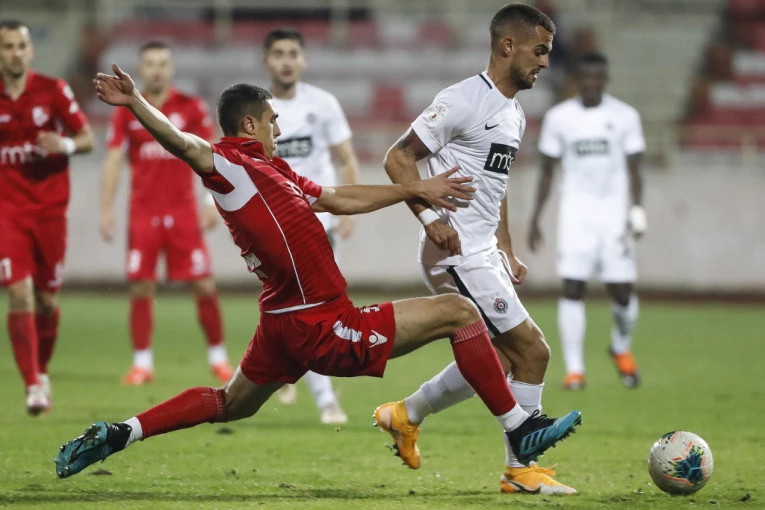 Partizan je bio nešto agilniji na protivničkoj polovini, a sve što je uradio bilo je po desnoj strani prodorima Aleksandra Lutovca. Desno krilo crno-belih nijednom nije centrirao na glavu najisturenijeg Žan Kristof Bajbeka, već su sve bile prizemne lopte iza leđa ofanzivaca.