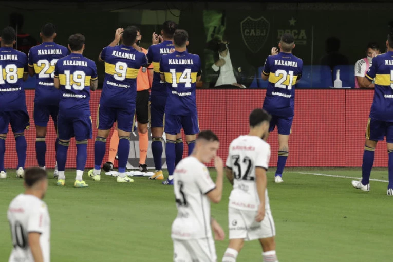 Foto: Tanjug/APPosle vodećeg pogotka u 12. minutu, svi igrači Boke su došli ispred VIP lože iz koje je Maradona često gledao utakmice i odali počast jednom od najboljih fudbalera ikada.