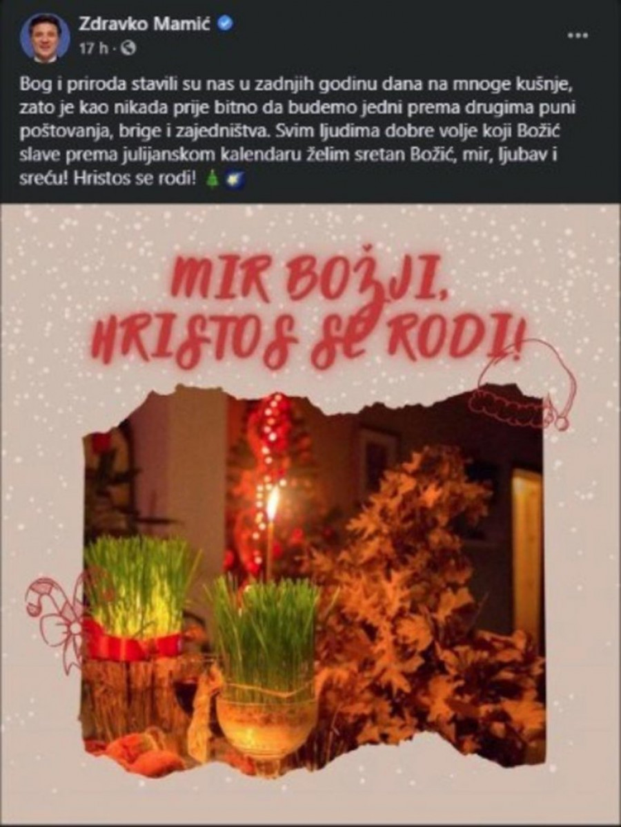 Zdravko Mamić je putem svog Fejsbuk profila uputio prelepu čestitku za Božić svim pravoslavnim vernicima.