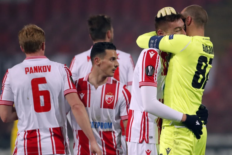 Milan Pavkov sa saigračima iz Crvene zvezde na meču 1/16 finala Lige Evrope protiv Milana