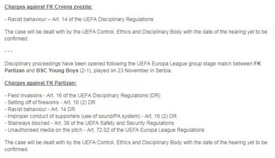 Evropska fudbalska unija (UEFA) pokrenula je disciplinske postupke protiv Partizana i Crvene zvezde zbog ispada navijača dva srpska kluba u utakmicama Lige Evropa.