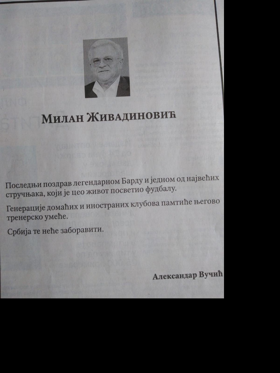 Predsednik Aleksandar Vučić dao je u listu "Politika" čitulju fudbalskom treneru Milanu Živadinoviću.