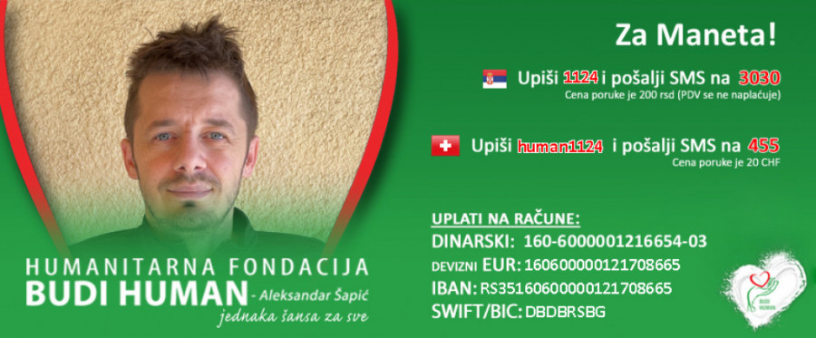 Humanitarna fondacija BUDI HUMAN Aleksandar Šapić prikuplja novčana sredstva za Maneta Lukića (1988).