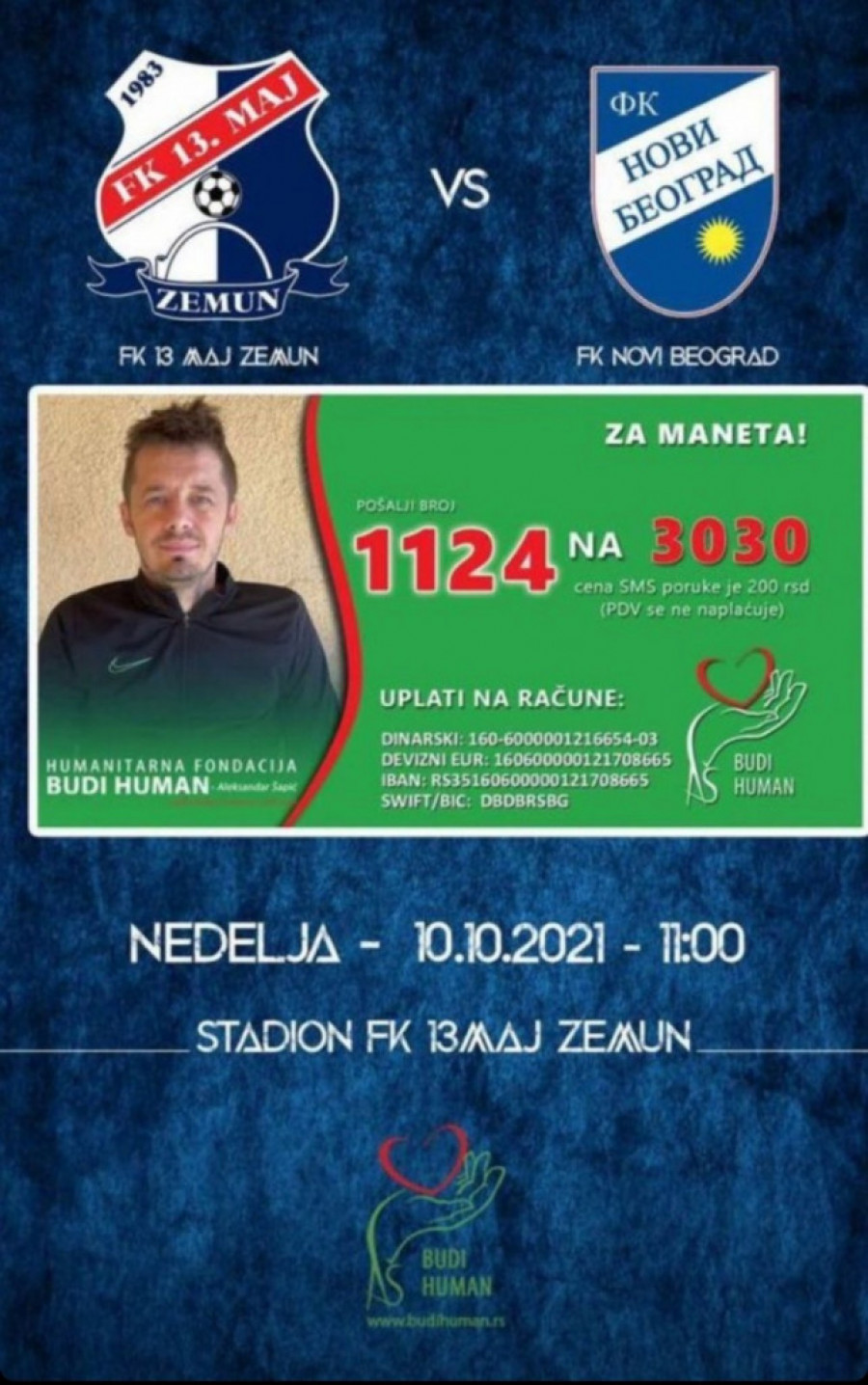 Kako bi Mane dobio neophodnu pomoć, u nedelju od 11 časova na stadionu "Zmaj" u Zemunu biće organizovan humanitaran meč između istoimenog kluba i Novog Beograda.