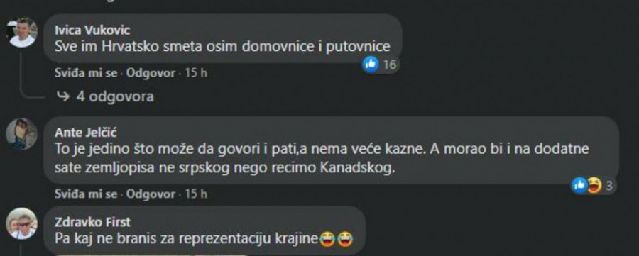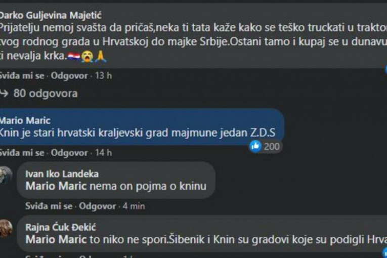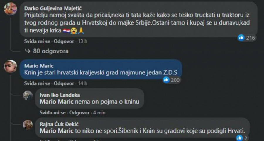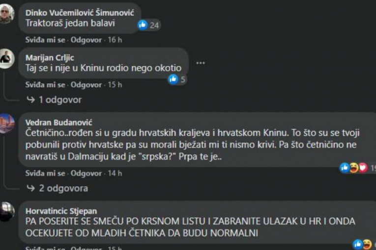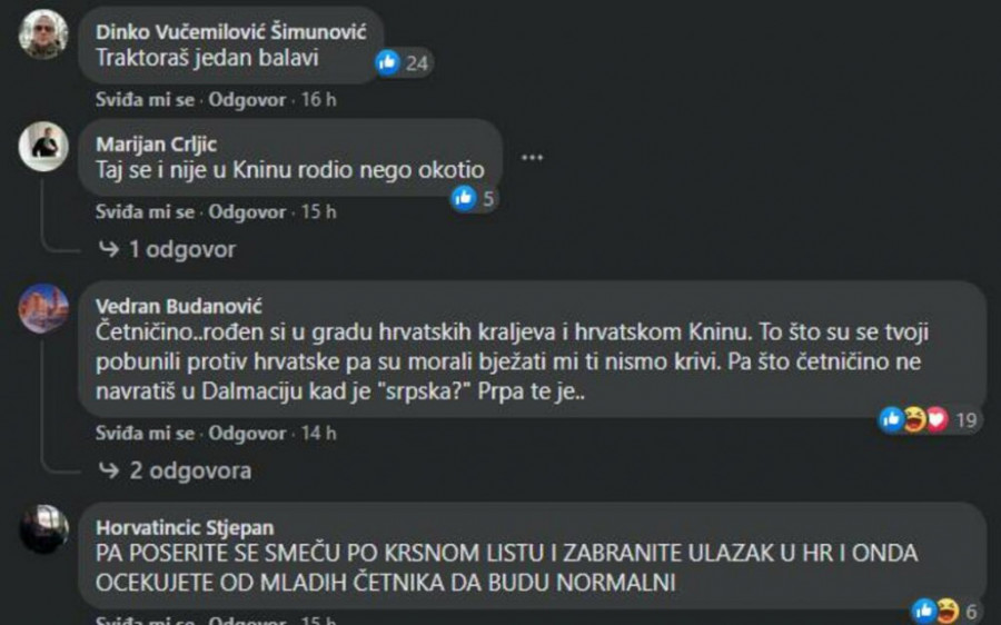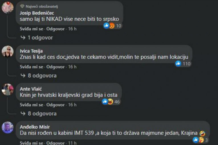 Tekst koji nosi naslov "U KRAJINI SAM ROĐEN, A NE U HRVATSKOJ! Ova pobeda je za srpsku Dalmaciju! Knin je zvezdaški grad" objavljen je uz komentar: "Vređa sve Hrvate, provokator!"