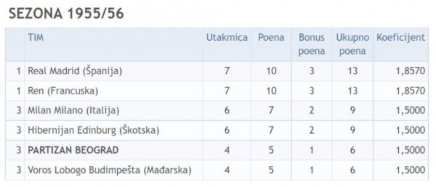 UEFA je sa evropskim rangiranjem klubova započela odmah od utakmice u Lisabonu, dakle već sa sezonom 1955/56, koja je premijerna sezona nadmetanja u evropskom klupskom fudbalu. Koga interesuje, napisaćemo da su se za pobedu dodeljivala 2 boda, za remi 1 bod, postojali su već tada i bonus bodovi (1 za četvrtfinale, 2 za polufinale i 3 za finale), a broj bodova se delio sa brojem odigranih mečeva i tako se dobijao klupski koeficijent. Evo vrha liste za sezonu 1955/56, pri čemu je 16 klubova igralo taj premijerni Kup Evrope: