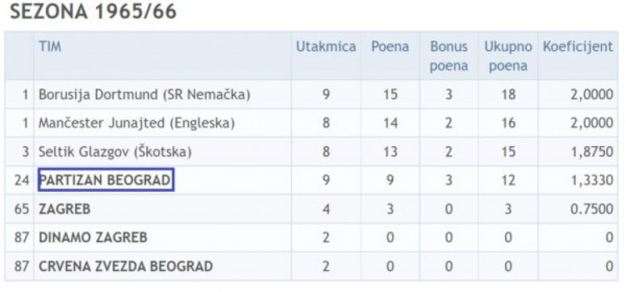 U sezoni 1965/66 Partizan beleži svoj, do danas najveći evropski uspeh – plasman u finale Kupa evropskih šampiona. To će mu međutim biti dovoljno da u narednu sezonu 1966/67 uđe tek kao 54. klub na UEFA rang listi, a razlog za to je činjenica da je UEFA u to doba potpuno isto vrednovala rezultate u sva tri takmičenja (uz Kup šampiona, igrali su se, da podsetimo, Kup sajamskih gradova i Kup pobednika kupova), što je sigurno bilo nepravedno iz ugla učesnika Kupa evropskih šampiona, pa samim tim i iz ugla Partizana koji je stigao sve do briselskog finala elitnog takmičenja u sezoni 1965/66. Uostalom, šta drugo pomisliti nego na nepravdu kada gore vidite beogradskog finalistu Kupa evropskih šampiona, čiji su se rezultati u toj sezoni 1965/66 vrednovali tako da je to bilo dovoljno samo za 24. mesto u toj jednoj sezoni?!?
