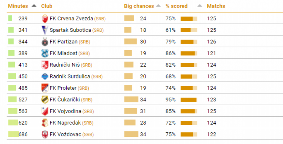Crveno-beli, su se na čelu tabele po istom kriterijumu našli i leta 2020. godine kada su na svakih 209 minuta izvodili udarac sa bele tačke.