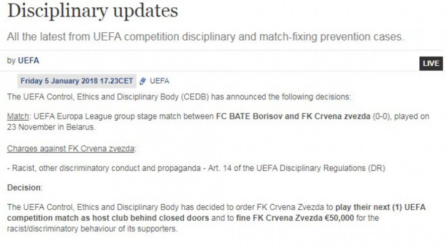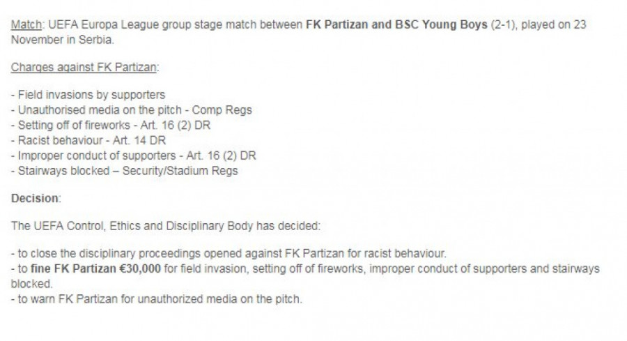 Odluka:UEFA kontrolna, etička i disciplinska komisija je odlučila da naredi Crvenoj zvezdi da narednu utakmicu u UEFA takmičenju u kojoj je domaćin, igra pred zatvorenim tribinama i da kazni Crvenu zvezdu 50.000 evra zbog rasističkog/diskriminatornog ponašanja njenih navijača. Kada je reč o odluci protiv Partizana, koji je dobro prošao, jer je kažnjen samo finansijski sa 30.000 evra, odluka UEFA glasi. |
