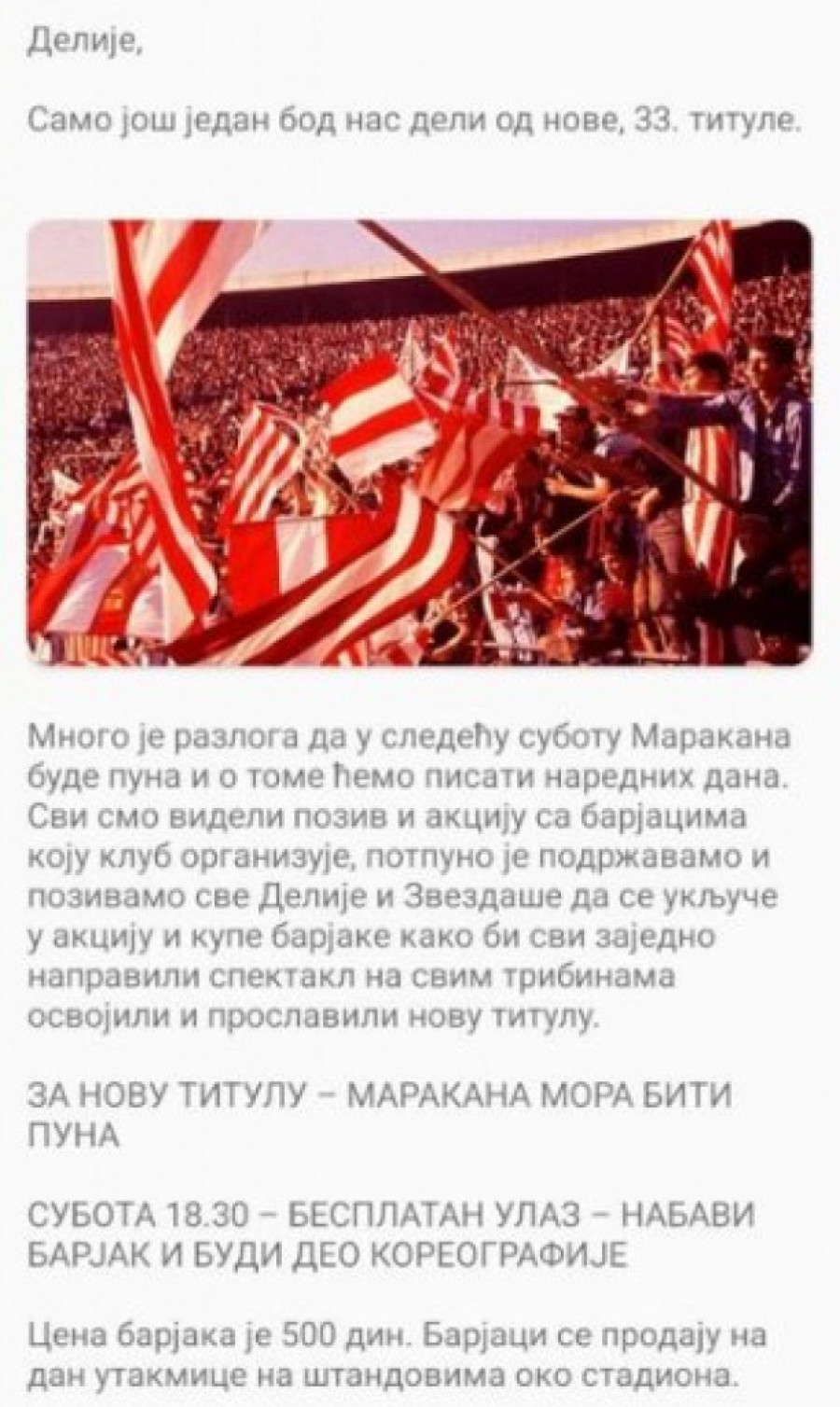 Mnogo je razloga da Marakana u subotu bude puna. Svi smo videli poziv i akciju sa barjacima koju klub organizuje, potpuno je podržavamo i pozivcamo sve Delije i Zvezdaše da se uključe u akciju i kupe barjake kako bi svi zajedno napravili spektakl na svim tribinama, osvojili i proslavili novu tituli.