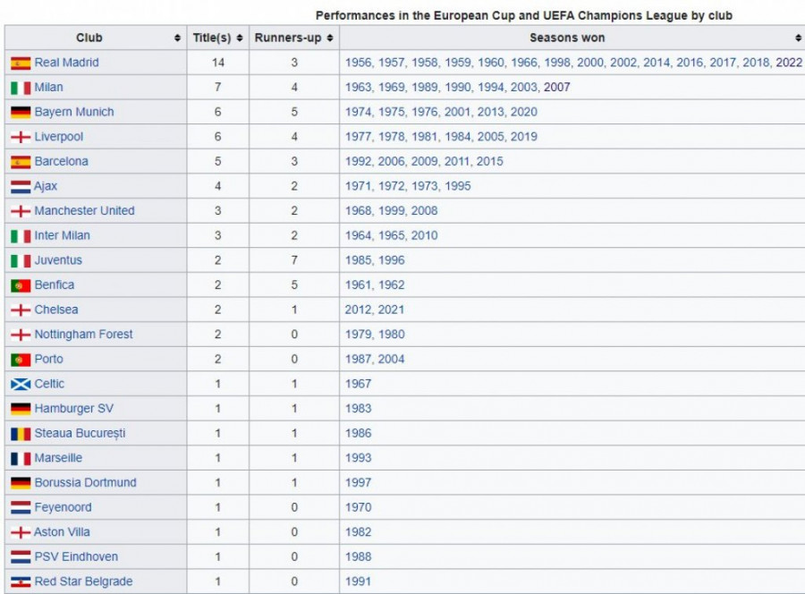 Naime, Reala Madrid je od subote 28. maja poravnat po broju titula Lige šampiona sa kompletnom engleskom Premijer ligom. Onoliko koliko trofeja ima klub iz španske prestonice, zajedno poseduju Liverpul (6), Mančester junajted (3), Čelzi (2), Notingem Forest (2) i Aston Vila (1).