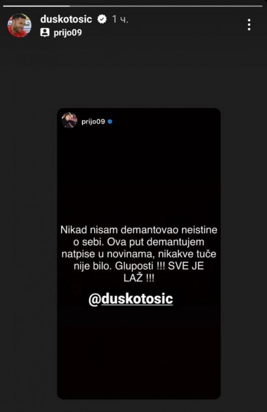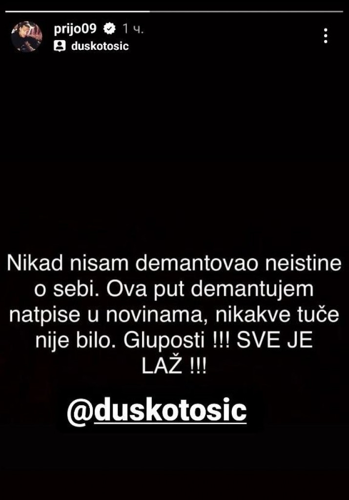 - Nikad nisam demantovao neistine o sebi. Ovaj put demantujem natpise u novinama, nikakve tuče nije bilo. Gluposti! Sve je laž - napisao je Prijović na Instagram storiju.