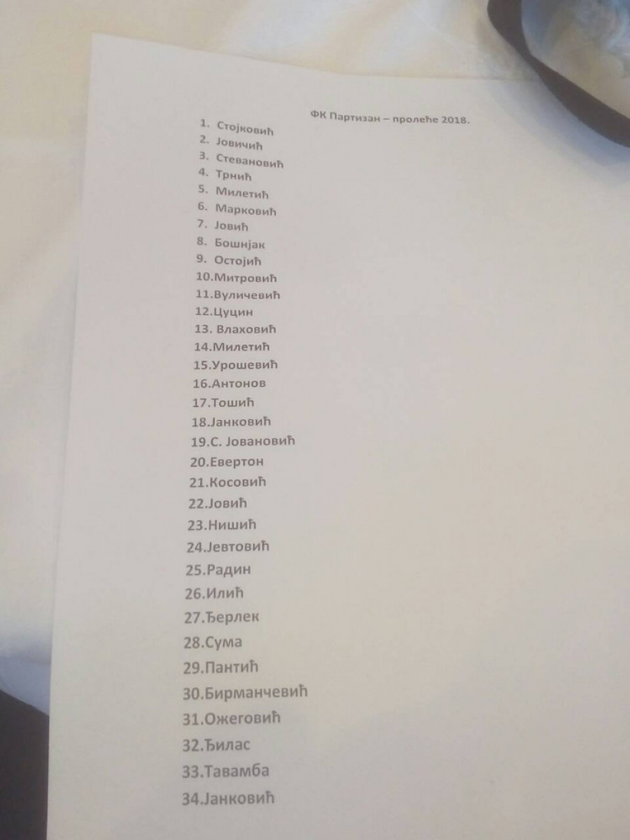 Na spisku trenera Miroslava Đukića našlo se 34 imena. Na spisku je i Everton Luiz, koji, za sada, odbija da produži ugovor sa Partizanom, iako su mu ponuđeni bolji uslovi.