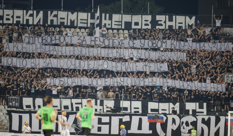 Grobari su dobro popunili tribine stadiona u Humskoj ulici, ali navijači su pred kraj prvog poluvremena podigli parolu upućenu upravi crno-belih.
