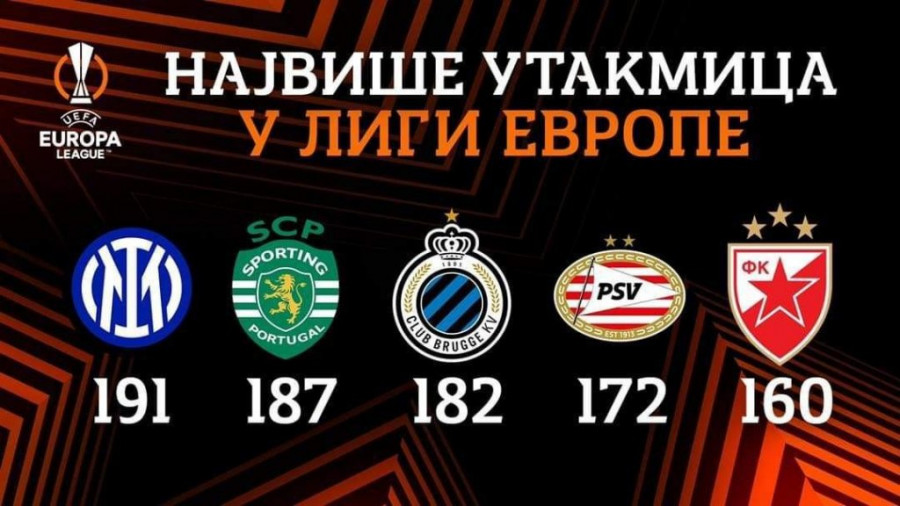 Naime, Crvena zvezda je trenutno peti klub u Evropi kada je reč o broju odigranih mečeva u Ligi Evrope.