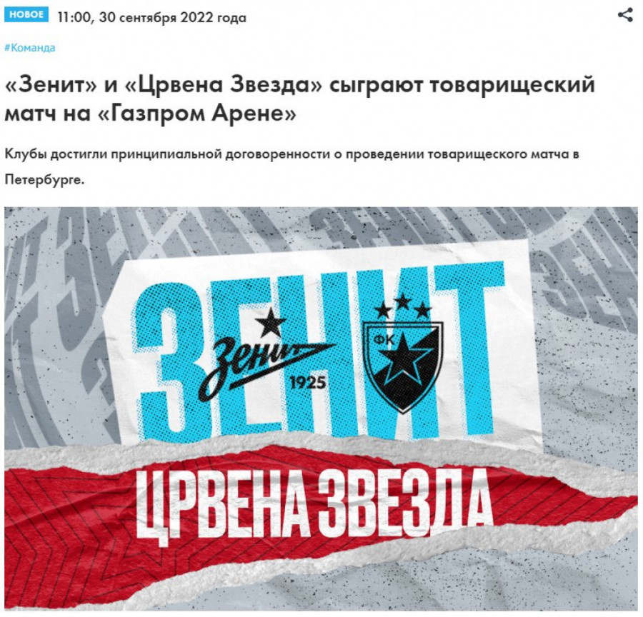 U julu mesecu 2022. godine Zenit i Crvena zvezda potpisali su dugoročan ugovor o saradnji pre nego što su odigrali prijateljski susret u Sočiju.