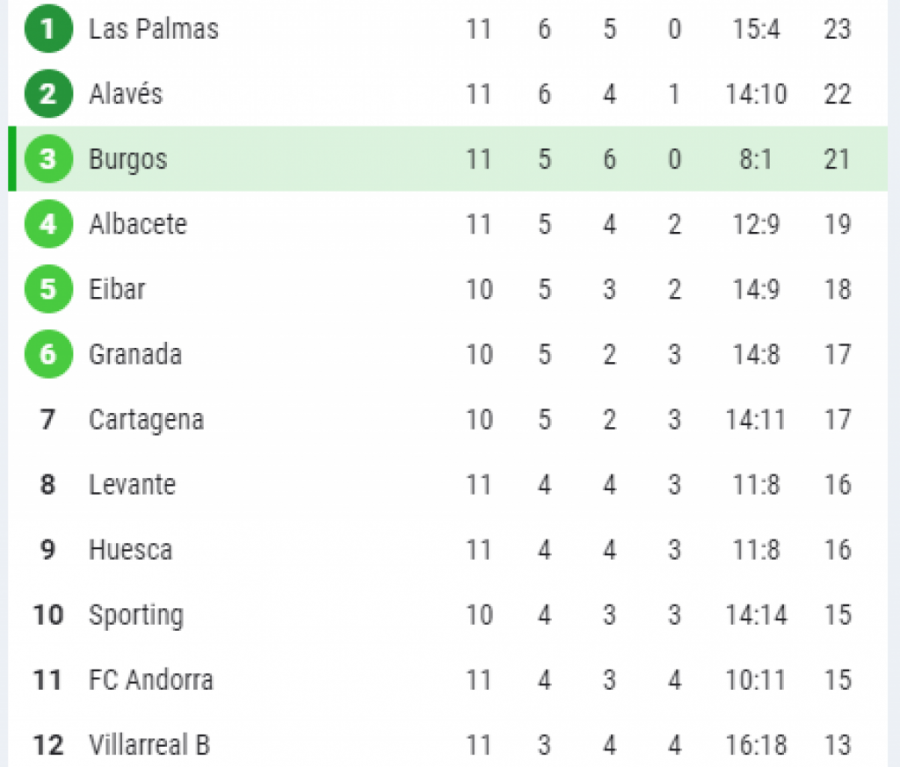 Posle 11. odigranih kola, Burgos se nalazi na trećem mestu u Segundi, sa 23 osvojena boda, uz gol razliku 8-1.