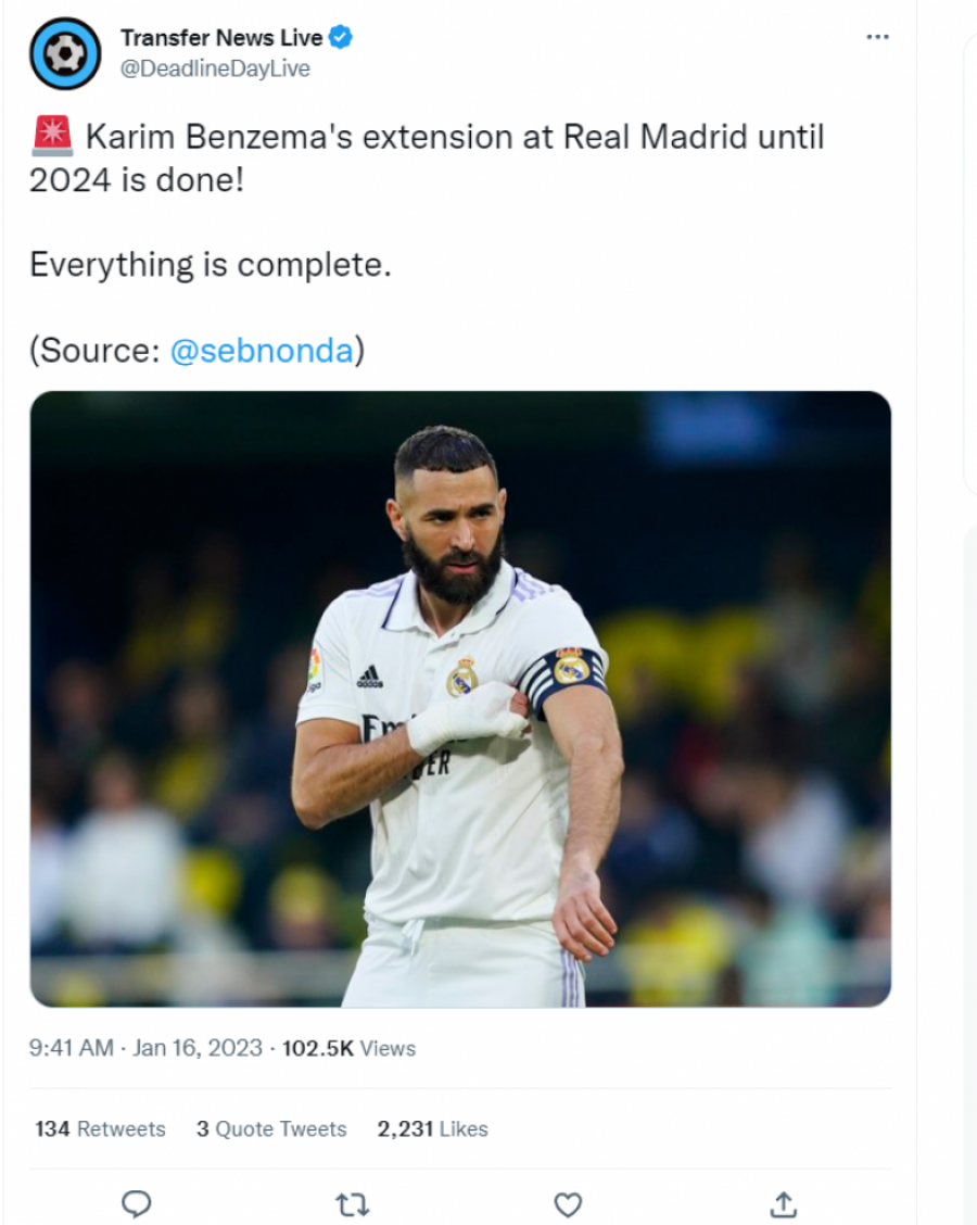 Osvajač Zlatne lopte parafiraće vernost "galaktikosima" do juna 2024. godine, a on je ušao u završnih šest meseci akutelnog ugovora. Francuz je odbio unosnu ponudu Al Nasra, tom prilikom istakavši da ne želi da karijeru nastavi u Saudijskoj Arabiji.