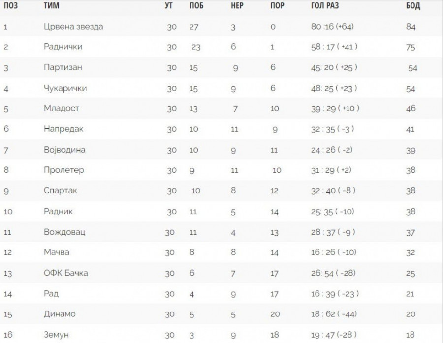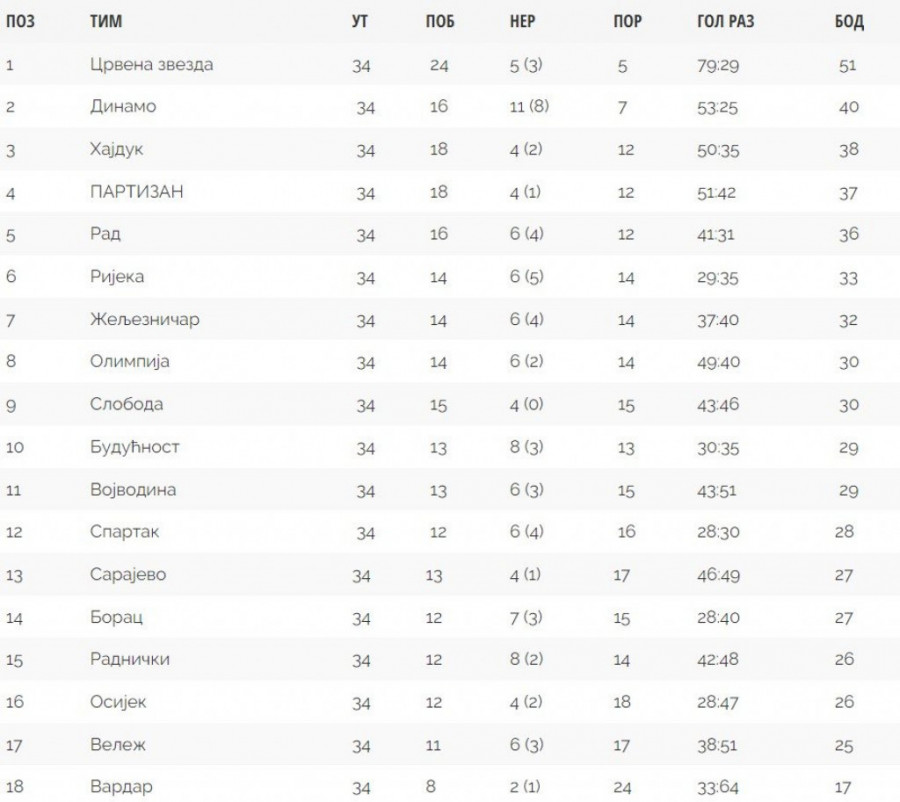 Prošlo je tačno 33 godine kada je poslednji put Partizan završio kao četvrtoplasirani u sezoni 1989/1990, pred sam raspad velike Jugoslavije. Tada su prvenstvo SFRJ završili na poziciji koju i sada imaju, ali iza Crvene zvezde, zagrebačkog Dinama i splitskog Hajduka, sa samo jednim bodovom više u to vreme odličnog Rada.