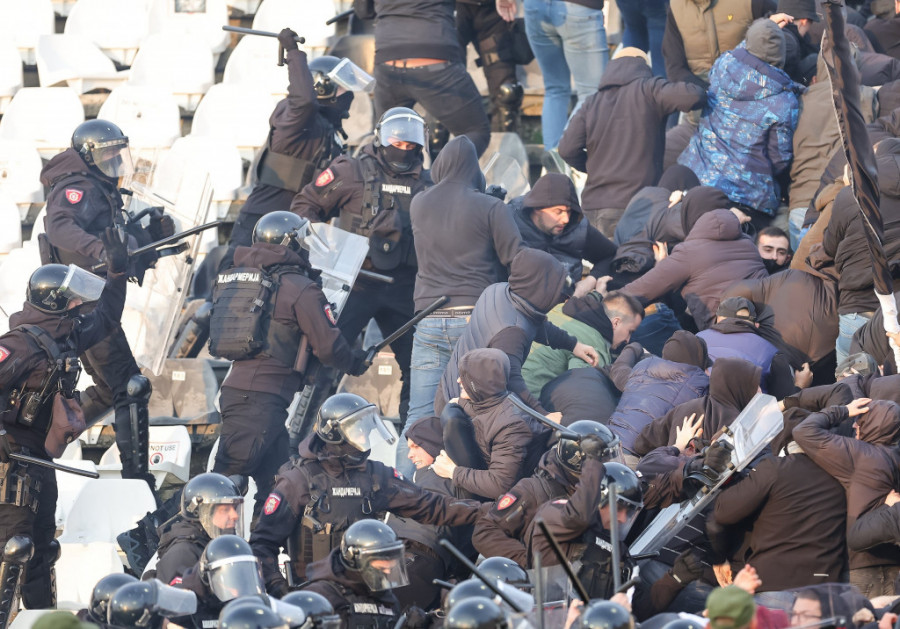 Utakmica 30. kola Mozzart Superlige Čukarički - Partizan prekinuta je peti put, zbog tuče "grobara" sa policijom.