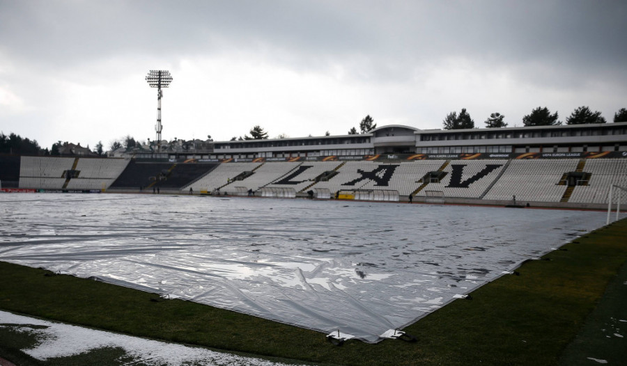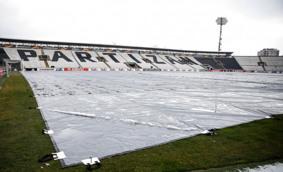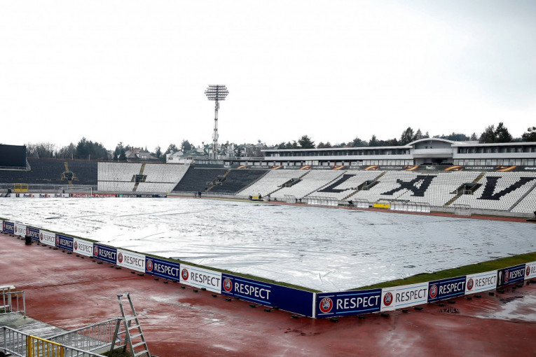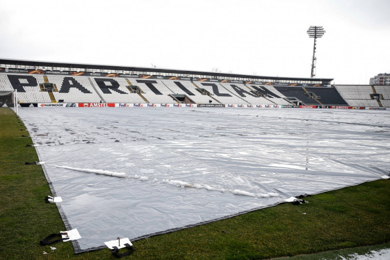 Teren stadiona Partizana prekriven je zbog kiše i snega.