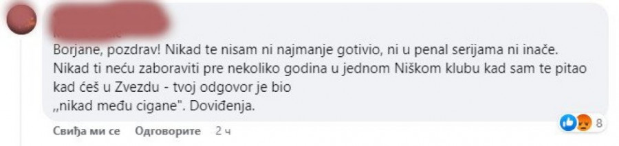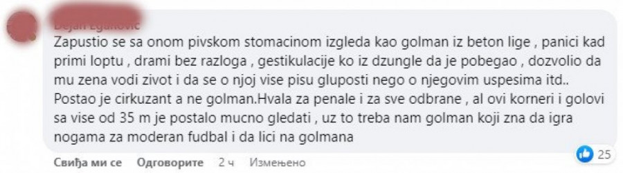 "Realno, poslednje dve godine, bicikl da gurnu sa centra terena ušao bi u gol pored njega", "Zapustio se sa onom pivskom stomačinom, izgleda kao golman iz beton lige, paniči kad primi loptu, drami bez razloga, gestikulacije ko iz džungle da je pobegao, dozvolio da mu žena vodi život i da se o njoj više pišu gluposti nego o njegovim uspesima itd... Postao je cirkuzant, a ne golman. Hvala za penale i za sve odbrane, ali ove kornere i golove sa više od 35 metara je postalo mučno gledati, uz to treba nam golman koji zna da igra nogama za moderan fudbal i da liči na golmana", "Ne goni te niko, sedi na klupu, budi drugi golman. Pa da tako ljudi razmišljaju niti jedna ekipa ne bi imala rezervnog golmana", "Borjane, pozdrav! Nikad te nisam ni najmanje gotivio, ni u penal serijama ni inače. Nikad ti neću zaboraviti pre nekoliko godina u jednom niškom klubu kad sam te pitao kad ćeš u Zvezdu - tvoj odgovor je bio 'nikad među cigane'. Doviđenja." - ovo su samo neki od komentara.