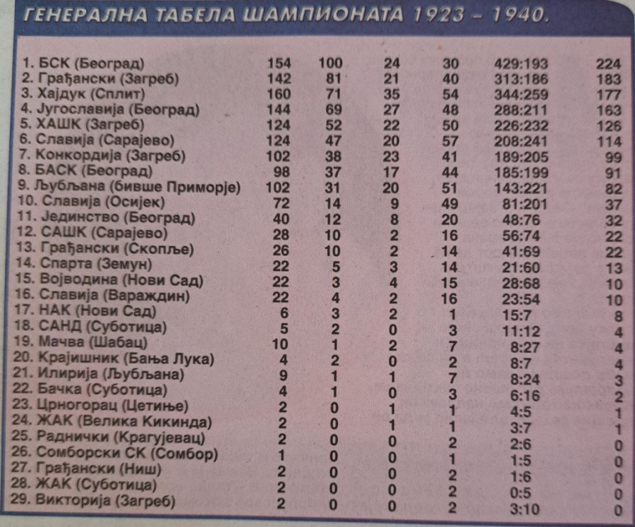 Ipak, i pored današanje dominacije beogradskih velikana, oni nisu uvek bili na čelu fudbala na ovim prostorima, jer su i jedan i drugi klub nastali 1945. godine. Ipak, fudbal se u Jugoslaviji igrao mnogo ranije, pa generalna tabela šampionata, koja obuhvata period od 1923. do 1940. godine, pokazuje koje su to ekipe tada bile predvodnice fudbala na ovim prostorima.