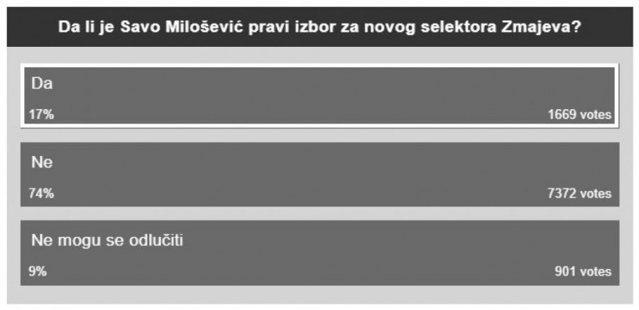 Međutim, ako je suditi na osnovu ankeke koju je sproveo portal Klix.ba, narod Bosne i Hercegovine ne želi Miloševića za trenera! To je poručilo čak 75 odsto od oko 10.000 anketiranih u trenutku pisanja ovog teksta na pitanje "Da li je Savo Milošević pravi izbor za novog selektora "zmajeva?".